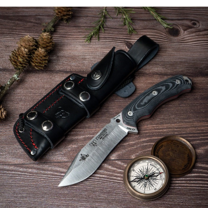 El Cudeman JJSK 1 fué diseñado en el año 2013 por Juan Jose Sánchez , fundador y Director de la escuela de supervivencia “JJ Adventure”. Este cuchillo fué pensado para romper las reglas de la supervivencia. Con el comenzamos a incluir las piedras de afilado junto con el espejo de señales, el paracord y el firesteel para hacer fuego sin necesidad de portar un mechero en su versión completa. Su hoja tiene una muesca pronunciada para rascar el firesteel y sacar chispa muy fácilmente. El mango de micarta negra con separadores rojos se acopla perfectamente a la mano y además tiene un rompecocos en la parte final. Mantiene la necesaria cremallera en su lomo para garantizar el agarre mientras se haga corte fino. Su acero es Böhler N-695 capaz de cortar perfectamente cualquier material que se interponga en su camino. Su funda de cuero negro con cosidos rojos es multiposición con trabillas y remaches para poderlo portar tanto vertical como horizontal e incluir el adaptador para piedra y pedernal. El diseño de esta funda fue la inspiración inicial para crear fundas similares como la de los modelos Entresierras ó Ent.