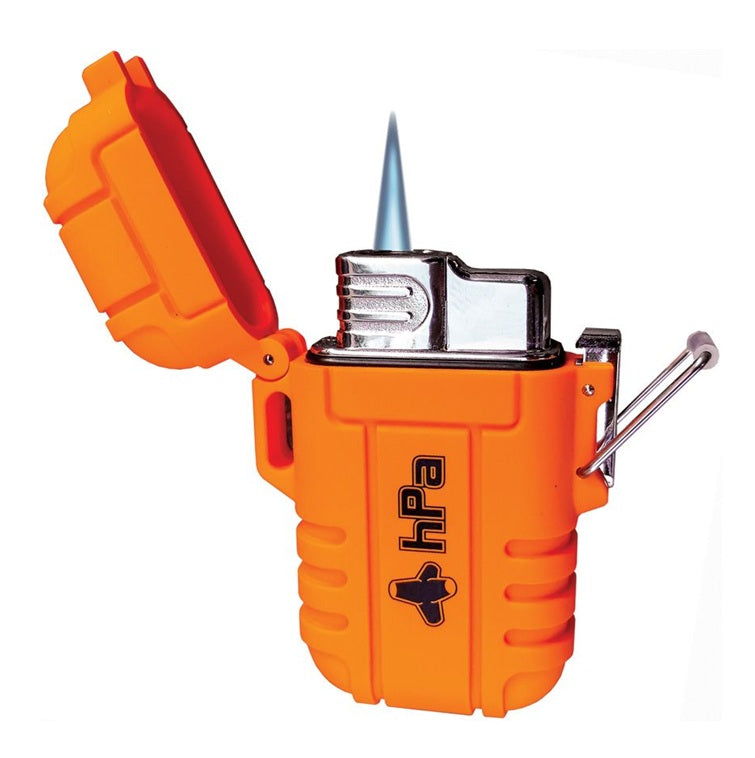 El Encendedor HPA Survival Jet Lighter ofrece ignición rápida y consistente al aire libre. Su carcasa plástica naranja con juntas y cerradura protege el mecanismo y el combustible. La llama doble y el encendido piezoeléctrico facilitan prender fogatas, estufas o mechas, incluso bajo lluvia.