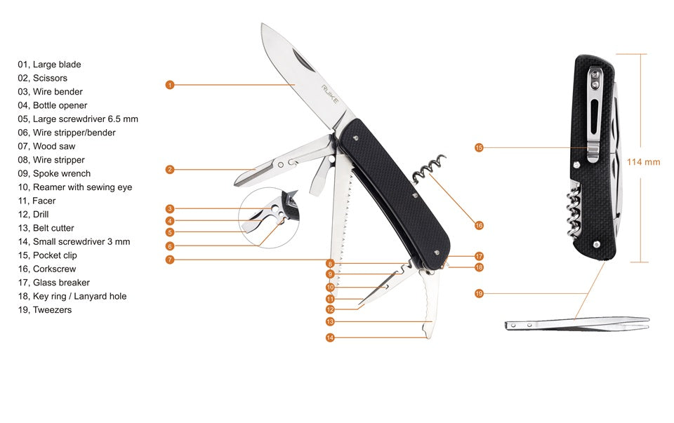 Con una hoja grande y herramientas robustas, la serie L es apta para todo tipo de actividades al aire libre y uso de emergencia.