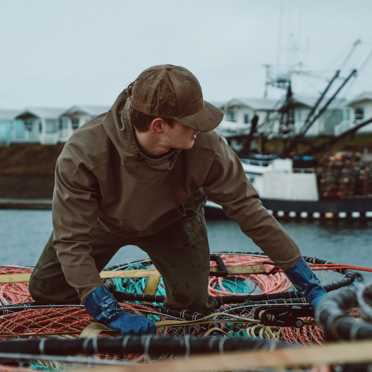 La Kryall es una sudadera con capucha resistente, a prueba de viento y lluvia, diseñada para pescadores comerciales y pensada para el trabajo en alta mar. Si la tenacidad pudiera plasmarse en una sudadera, la Kryall sería la prenda ideal.